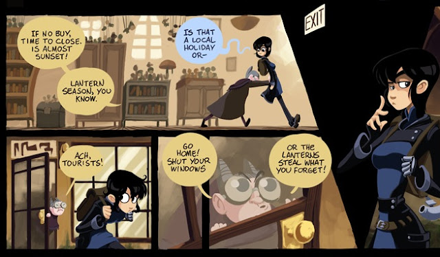Last week I praised the striking composition that can be found in Family Man. At the risk of sounding repetitive, Dresden Codak often has truly innovative composition. Even in the most straightforward grid layouts, every bit of space is put to use, and often the flow of action goes in unexpected directions. For example, take this development in "Dungeons and Discourse," the Dresden Codak roleplaying game of choice. In the space of a single panel, events curve around a barrier and reverse direction.