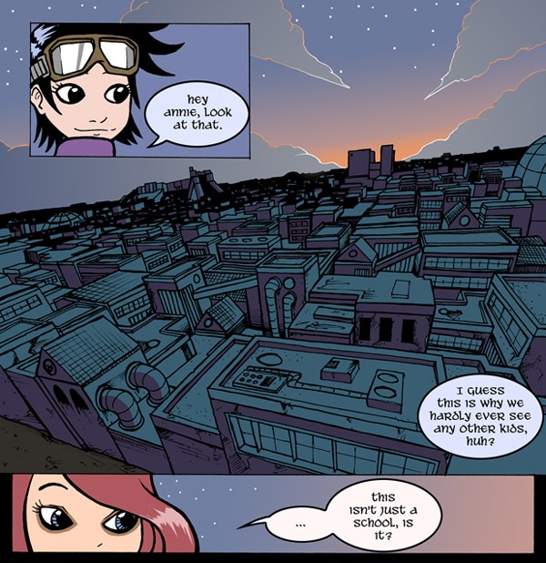 Gunnerkrigg Court, the location, serves as a school... and much more. Antimony Carver, the focal character, is a student at Gunnerkrigg Court, and as she learns more about the history and technomagical nature of the Court, so does the reader.