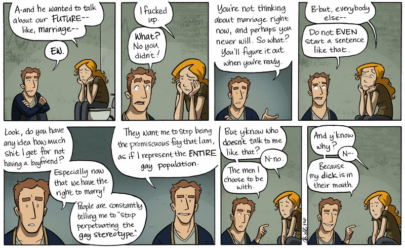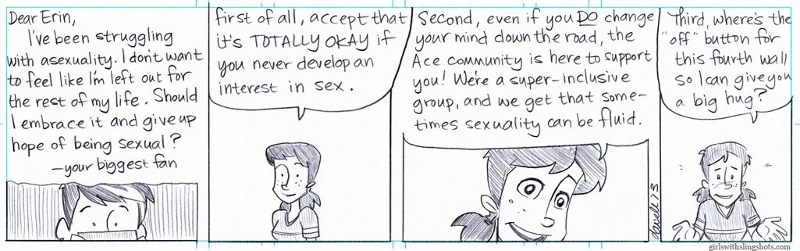 One thing that I really appreciate about Girls with Slingshots that I haven’t seen elsewhere is a fantastic portrayal of an asexual. Erin is friendly, enthusiastic, and an excellent role model for anyone who feels that they might fit in with an asexual identity. (Please note that the following strip does constitute a spoiler, so only read on if you’re willing to have certain outcomes taken as granted when you get to the Jamie-trying-to-find-love storyline stuff.)