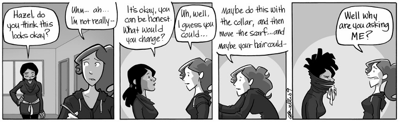 It’s also nice to see a comic featuring so many women, with so many different body types. There are the obvious extremes in Hazel and Jamie, who are beautiful in completely different ways, but just about every woman in this comic would be visually distinct from every other woman just by their silhouettes. Any time I worry about the portrayal of women in comics, when there are so many identical-looking women with huge hips and breasts and ridiculously thin waists, my go-to counterexample is Girls with Slingshots. It’s far from the only webcomic that features well-rendered examples of a variety of female figures, but I think it’s one of the clearest examples of how to draw women well.