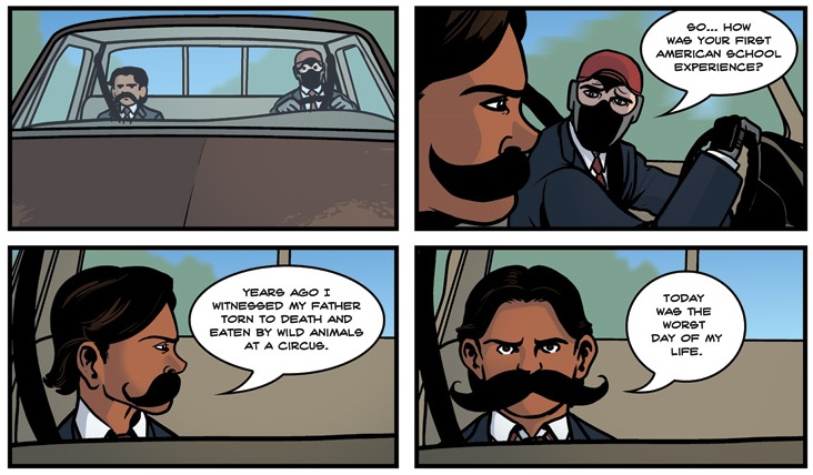 Lots of characters are caught up in these kinds of cultural precepts. Sexism pops up in multiple instances, and at one point Dr. McNinja’s brother, Sean Dark Smoke Puncher, responds to an accusation of reading a nerdy book by declaring “Books are gay!” If I heard a teenager say that I think I’d just start shouting at him about using “gay” as a derogatory term. In terms of the general narrative, these attitudes aren’t met with any apparent approval or disapproval. It’s just part of the world that these characters inhabit, the cultural lingo that they’re used to and which they use without thinking about it. For all that Dr. McNinja is a world of awesome, extraordinary things, it still comes with a lot of the unfortunate cultural baggage of our own world.