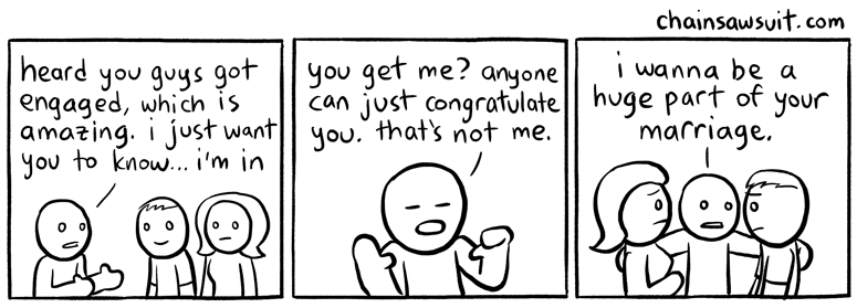 Chainsawsuit typically presents quick, simple jokes, using running gags, absurdity, exaggeration, or whatever other techniques are required to make a joke work. The three-panel format is almost incontrovertible; nearly every Chainsawsuit installment fits into this exact shape, though a handful will add a second row for a total of six panels. This is ephemeral humor; usually providing a brief escapism into this comical world before one moves on to either reality or the next source of escape. Even so, there are a handful of Chainsawsuit jokes that really stick with me, that I think back to months or years after reading them and still crack a smile.