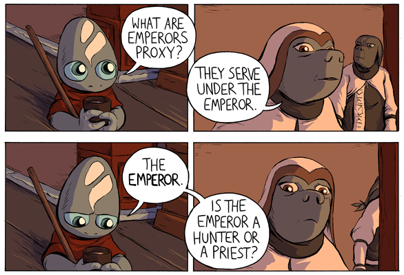 Vattu is written and drawn by Evan Dahm and updates Mondays, Wednesdays and Fridays. Do you like stories that toss you into a strange and unfamiliar setting and let you get acclimated at your own pace? I love it when stories do that. It’s like teaching you a language by dropping you off in a foreign country, except with far fewer chances of getting robbed or ending up hopelessly lost. Let the characters put themselves in danger for your amusement while you stay safe at home, and watch history unfold before your eyes.