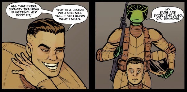 Of course, it wouldn’t make any sense whatsoever for Lt Adelina to have a significant bust. One, she’s a lizard, and two, she’s wearing armor. I feel bad even pointing this out, because it’s not so much a good choice as it is the lack of a bad choice, but I’ve seen so many inexplicable drawings of sexy lizard women that just seeing one case of an artist doing the sensible thing instead reaffirms my hope for humanity. Cpl Simmons may be sexualizing Lt Adelina, but the artist does not sink to the level of his characters, and draws her looking just like the soldier that she is.