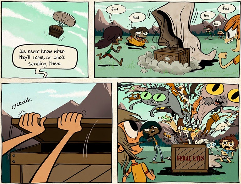Occasional supply drops fall in from the sky, which would support the idea that someone knows these kids are there and is taking steps to look after them, but the nature of the “supplies” is variable at best. I get the impression that the crates dropped onto the campground may be less intended to provide for the children, and more to find a dumping ground for unwanted goods. Every supply drop that’s been directly shown in the comic is either harmful or, at best, neutral. It’s implied that some supply drops do contain food, because there’s no other clear way for the kids to have obtained what food stores they have, but I wouldn’t be surprised to learn that the food is expired or otherwise deemed unfit for consumption.