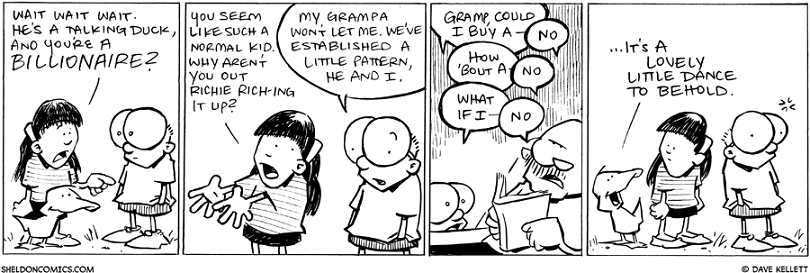 That last bit is the “gimmick” behind the comic. A one-sentence summary of Sheldon would run “It’s about a 10-year-old billionaire who lives with his grampa and a talking duck.” (We’ll get to the talking duck in a moment.) However, that summary really doesn’t give one an idea of what it feels like to read Sheldon. For all his wealth, Sheldon’s lifestyle is largely reminiscent of what it would have been if he hadn’t become rich. Gramps clearly does what he can to make sure Sheldon will grow up to be a well-adjusted adult, coming out of a happy and healthy childhood with as few changes to his home life and routine as possible.